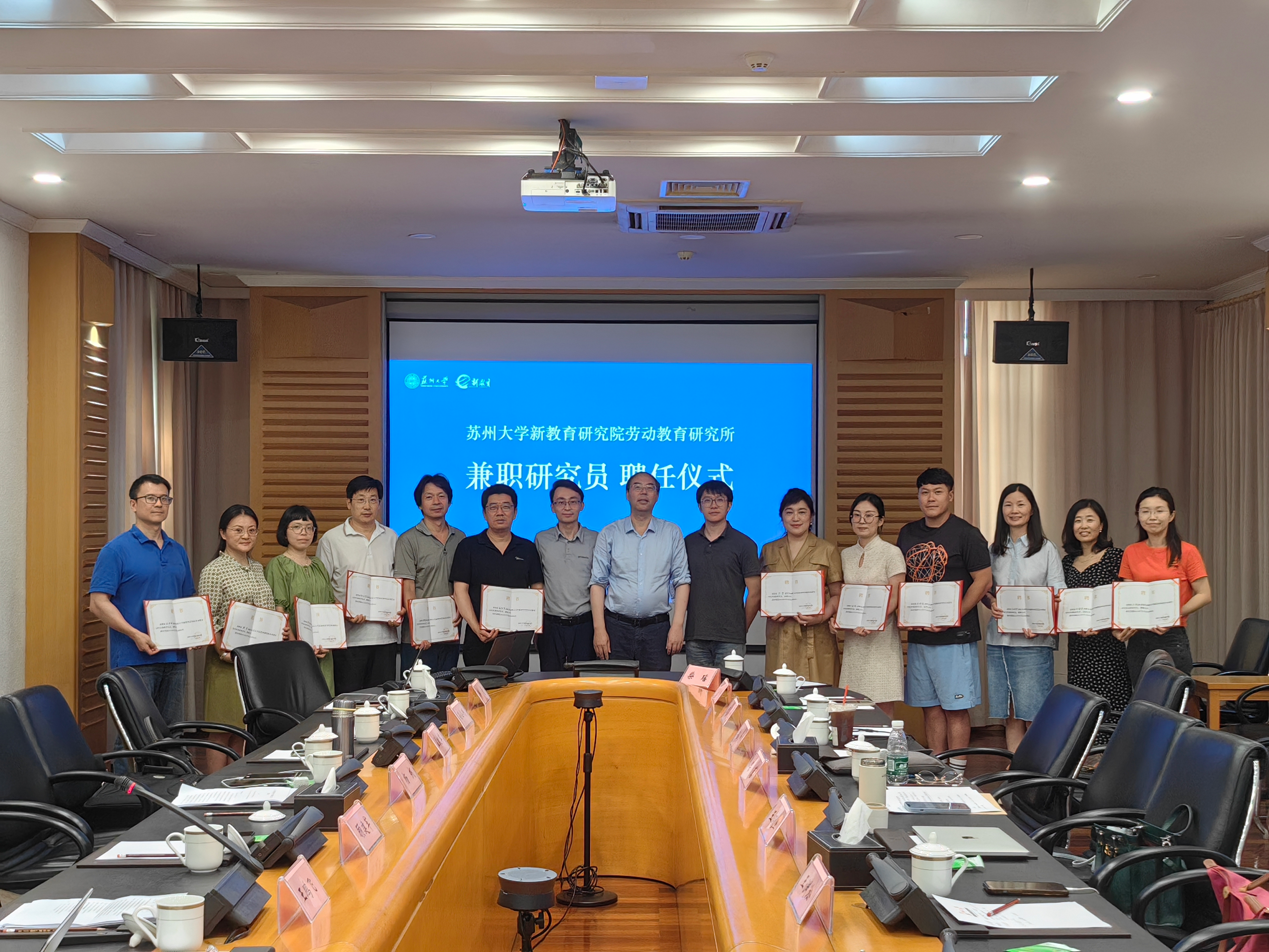 会议期间,还举行了兼职研究员聘任仪式,孟献军、孙公刚、王少峰、韩东铭、梁惠燕、韩青、朱丽萍、王晓丛、吕蓉、华倩倩、王渊淞、魏咏12位教科研人员被聘为苏州大学新教育研究院劳动教育研究所兼职研究员。这将进一步壮大劳动教育的科研力量,全力打造一支由教育部长江学者特聘教授、国家劳动课程标准组组长领衔,劳动教育国家名师、中小学特级教师、劳动课程标准组核心成员、一线优秀校长、教研员和教师组成的专业化劳动教育学术团队,全面加强新时代大中小学劳动教育的学术支持和保障工作。
