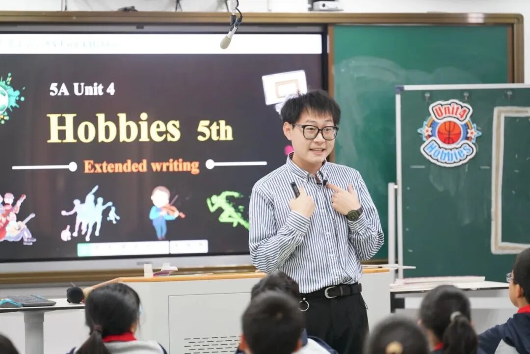 许明明老师执教五年级上册《Unit5 Hobbies》融合写作课,教态亲切自然、课堂氛围热烈。课的一开始,许老师通过chant的形式进行师生互动。通过绘本层层深入地分析,帮助学生理清绘本故事线和情感线并掌握写作技巧,学生能用课上所学为自己的朋友写一封社团推荐信。整节课学生的思维开放,合作探究能力强,学生在真实情境中乐学、慧学。