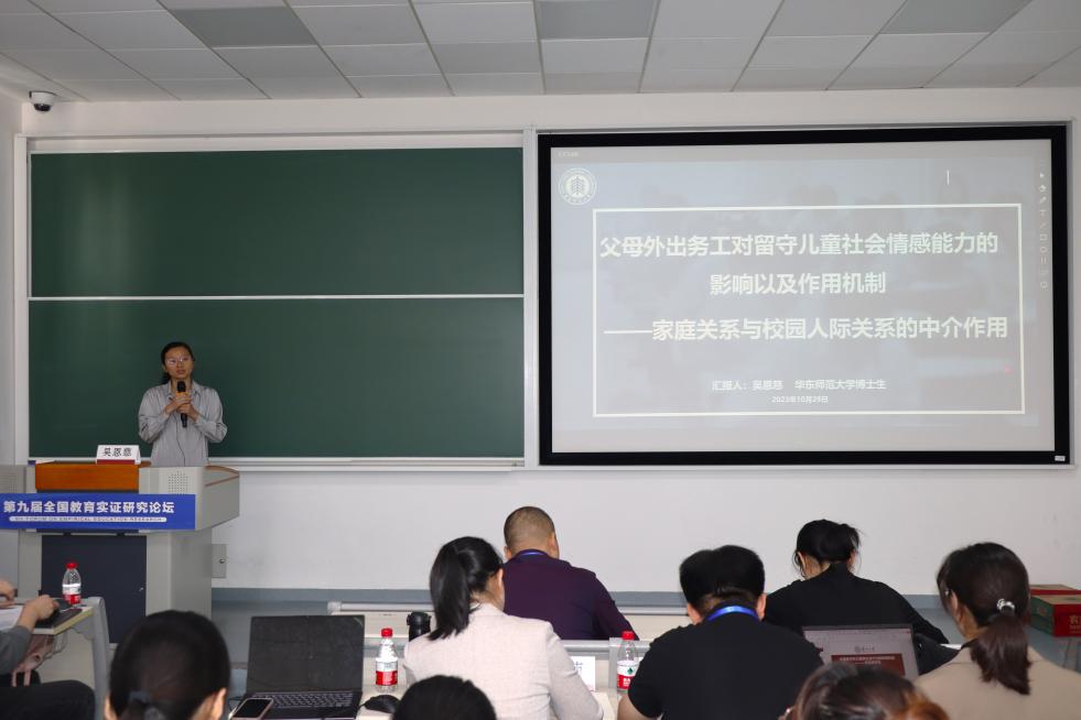 论坛的主题报告部分由苏州大学教育学院硕士研究生朱蓥彬主持,8名同学进行了精彩的学术汇报。华东师范大学教育学部博士研究生吴恩慈以《父母外出务工对留守儿童社会情感能力的影响以及作用机制——家庭关系与校园人际关系的中介作用》为题分享了研究发现:父母外出务工对留守儿童社会情感能力的发展存在负向影响且城乡不同群体中留守儿童的社会情感能力的影响有显著差异。